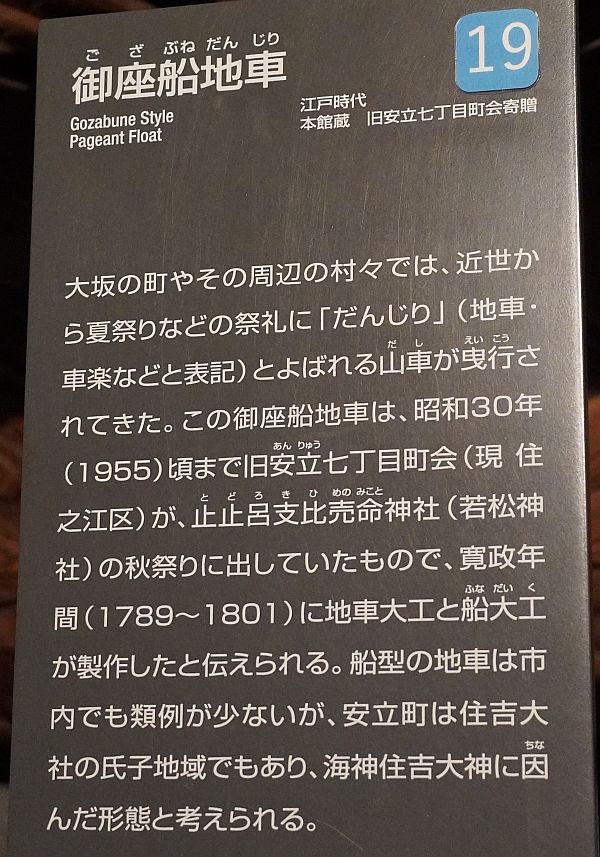 「この御座船地車は昭和30年頃まで旧安立7町目自治会(現住之江区)が、
