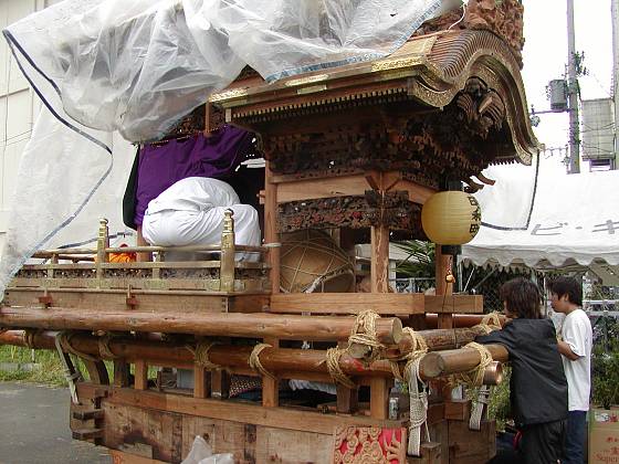 空き地で準備中の昭和町地車 見送り三枚板部分もはめ込み式です |