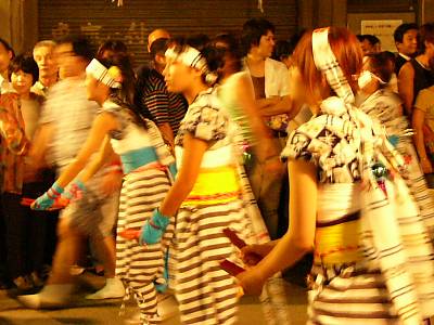 華やかな衣装と傘や四つ竹を使った華麗な踊りで観客を魅了する