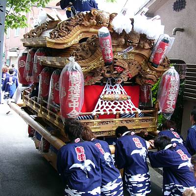 彌栄神社の鳥居をくぐりぬけて鶴橋地車夏祭り曳行出発 |