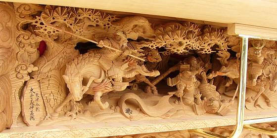 左側泥幕彫り物「木曽義仲の勇戦 粟津合戦」中山久義氏作