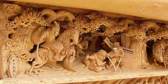 正面泥幕彫り物「堀川夜討」木下賢治氏作