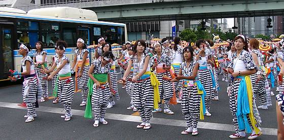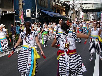御堂筋の真ん中を行く四つ竹・傘踊りの行列