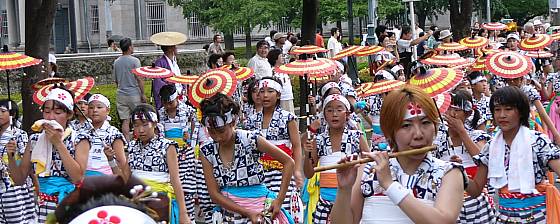 傘踊りの行列は大江橋を渡って中ノ島へやってきました