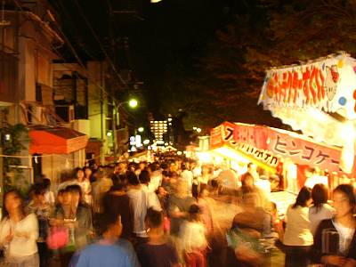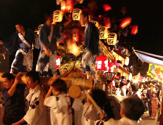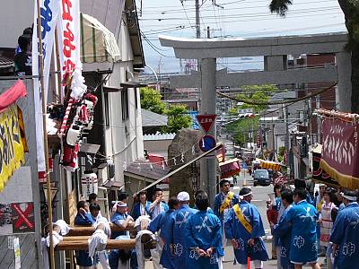 宮入は神社の鳥居よりずっと下の夜店が立ち並ぶところから、地車の前を担ぎ上げた