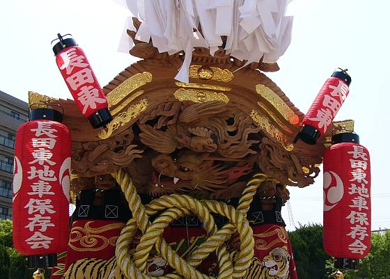 では、長田東地車の修理完成入魂式での画像をご覧下さい。2005.5.8間違い修正