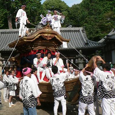 境内中央でまず拝殿へ向かって地車後方を持ち上げ礼をして