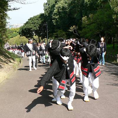荒山公園の緑の中、力一杯坂道を曳行していく様子は