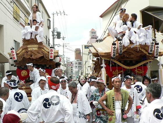 4台の地車が顔をつきあわせ、一斉にそして交互に手打ちをしてお互いの親交を