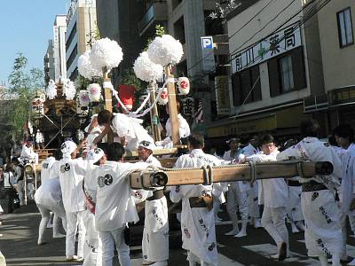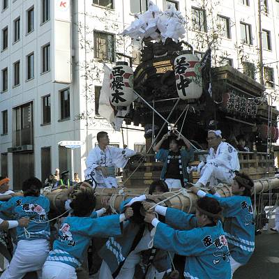 まず貴布禰地区の8台の地車が集合して出発したあとに築地地区の7台の地車が