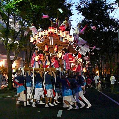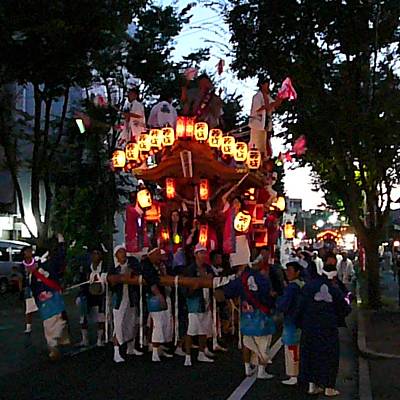 街の灯りと地車の提灯の灯り、そして街路樹の深緑、いい感じですね。