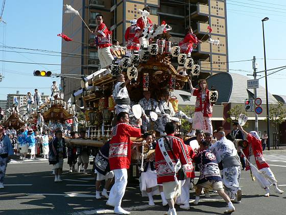 そして稲荷筋と国道2号線との交差点にある赤鳥居を3台の地車が次々とくぐり抜けて