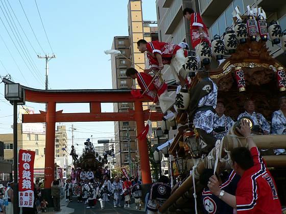 赤鳥居をくぐり抜ける森区地車