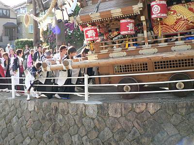 まもなく神社境内を目指して青木区地車も狭くて曲がりくねった坂道を登って