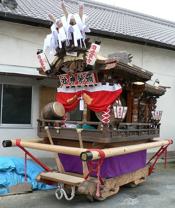 午前9時半 岡地車は飾り付けされて小屋近く茨神社前の