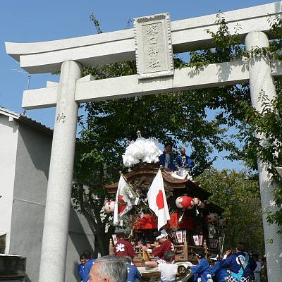 塚口神社大鳥居をくぐり抜けて宮出する北町地車