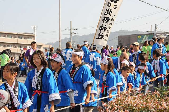たくさんの子ども達が元気いっぱい地車を曳いています。