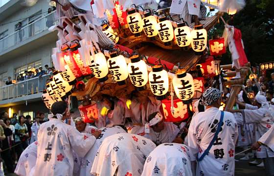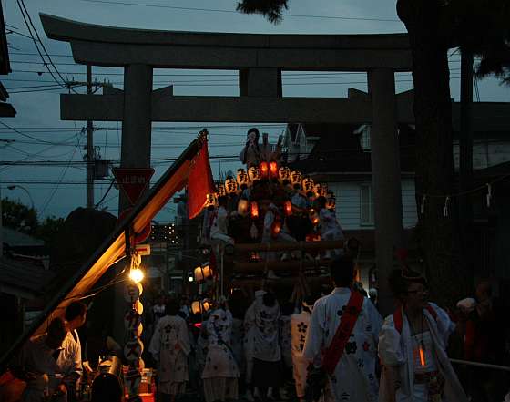 どんどん暮れていく五毛神社の参道では、躍動感ある上野地車の宮入曳行が