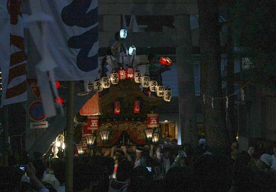 五毛天神の鳥居をくぐり抜け、宮入する五毛地車