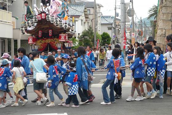灘の山手の町並みの中を進む上野地車