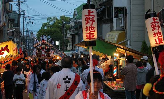 夜店が並ぶ参道を縫うようにして上野地車が進みます。