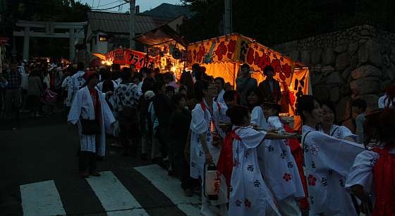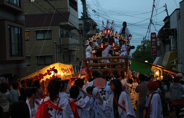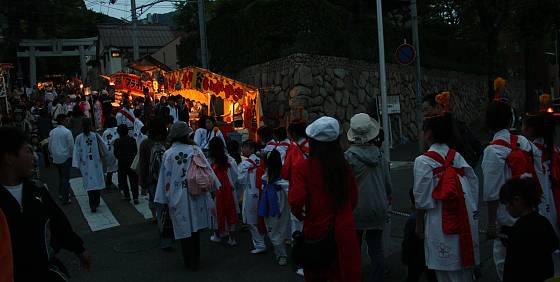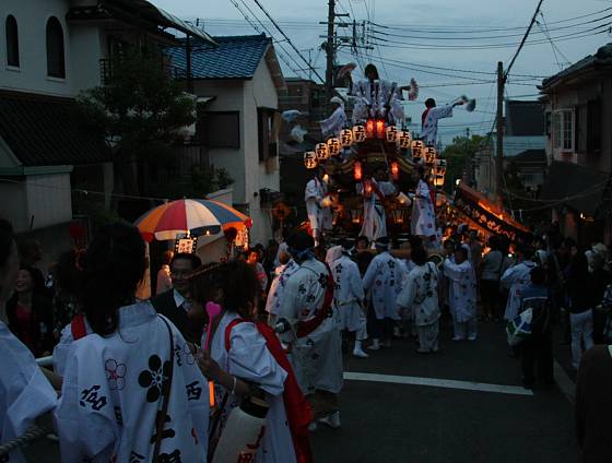 どんどん暮れていく五毛神社の参道では、躍動感ある上野地車の宮入曳行が