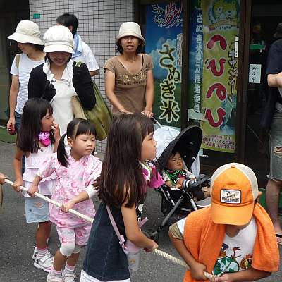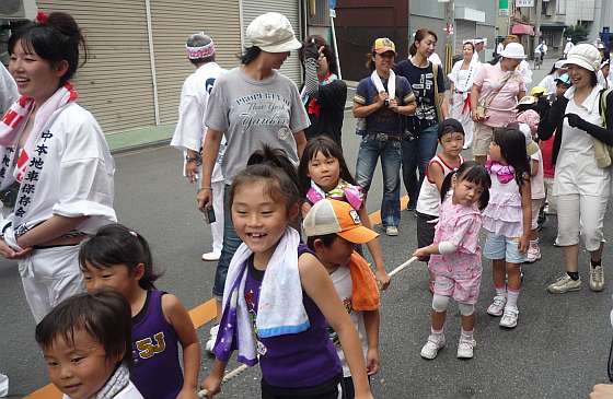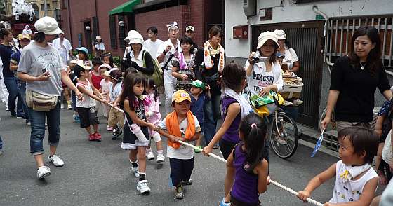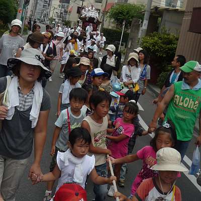 では、東成区八王子神社の中本地車夏祭り曳行画像その5:園児曳行をご覧下さい。