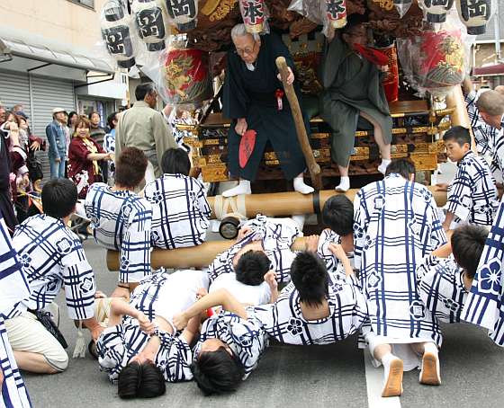 地車の後ろでは若手が反り返るような格好で頑張っていました。