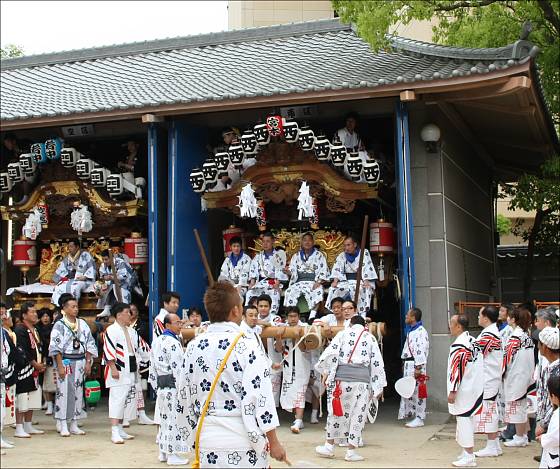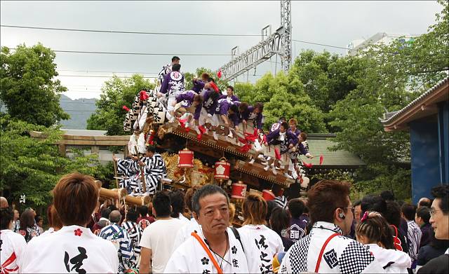 ちょうど午後0時に神社に到着、呉田区地車が7連小屋の前に出て宮出準備
