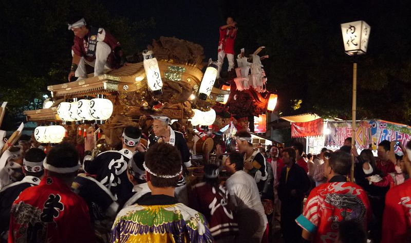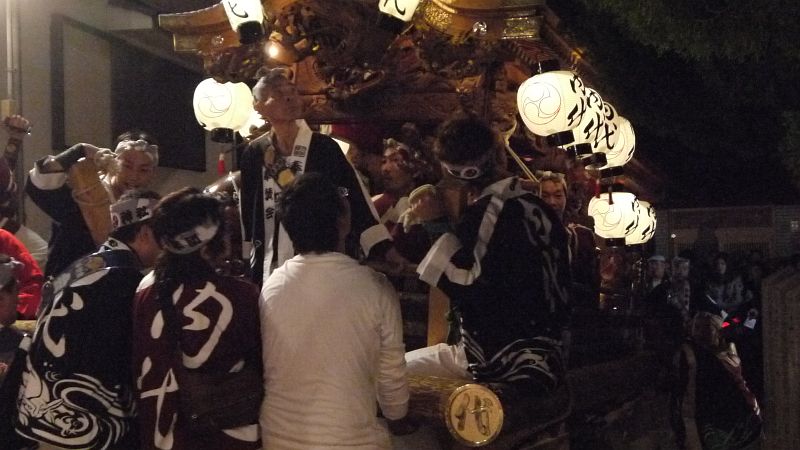 それぞれ大宮神社目指して曳行、そして午後6時45分頃に2台の地車が合わせ、