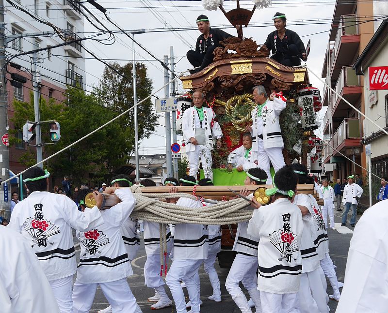 四条ふるさと祭りではこの交差点で90度向きを変えて