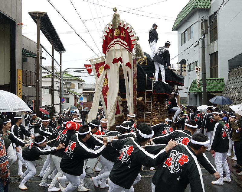 小雨が降る中、宮山地車が踞尾八幡神社目指して出発しました。