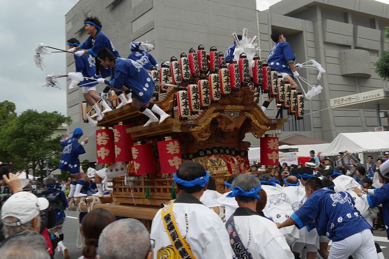 地車の周りで声を出したり飛び跳ねたり