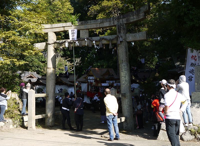 太い曳き綱とともに野間中地車が鳥居をくぐり抜けて出てきました。