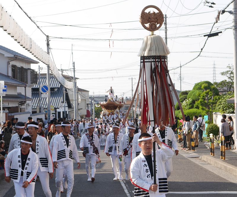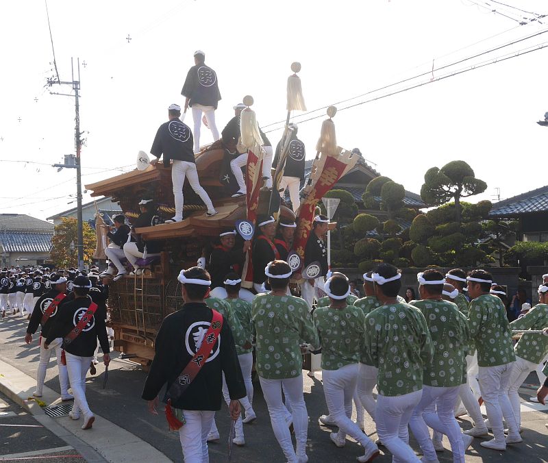 聖神社鳥居を背にしてメインストリートを進んでくる地車の正面から撮れる