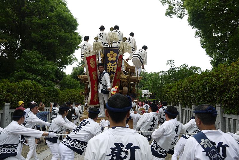 入魂式に向けて、大鳥大社の鳥居をくぐり抜け、参道を進む新在家地車を追いかけました。