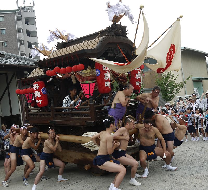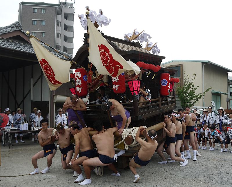 締め込み姿の男性たちが地車の後ろを担ぎ上げて廻しています。