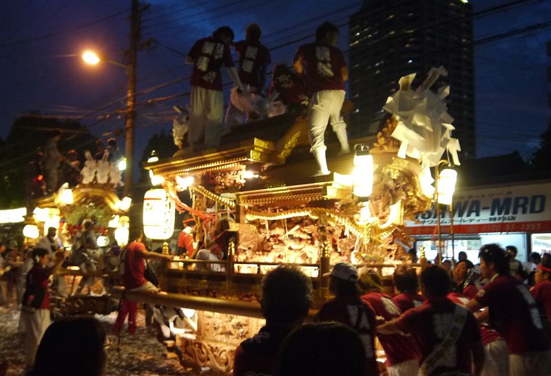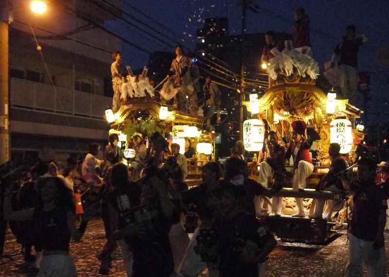 提灯の灯りで色鮮やかな2台の地車の並走、見応えありますね。