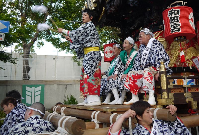 そして屋根の上と地車の前でははたきを持った若衆が踊り始めました。