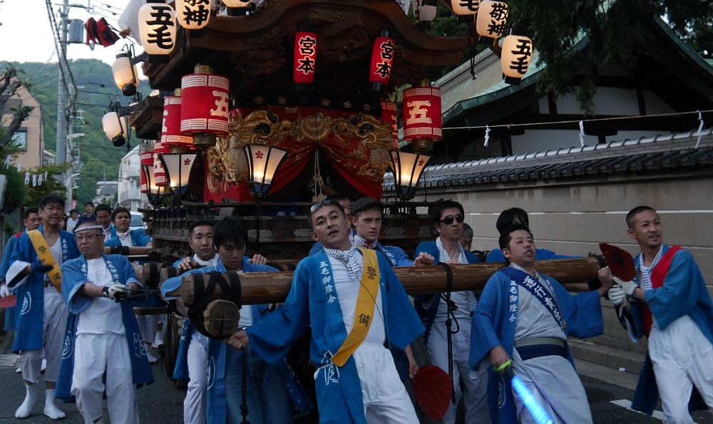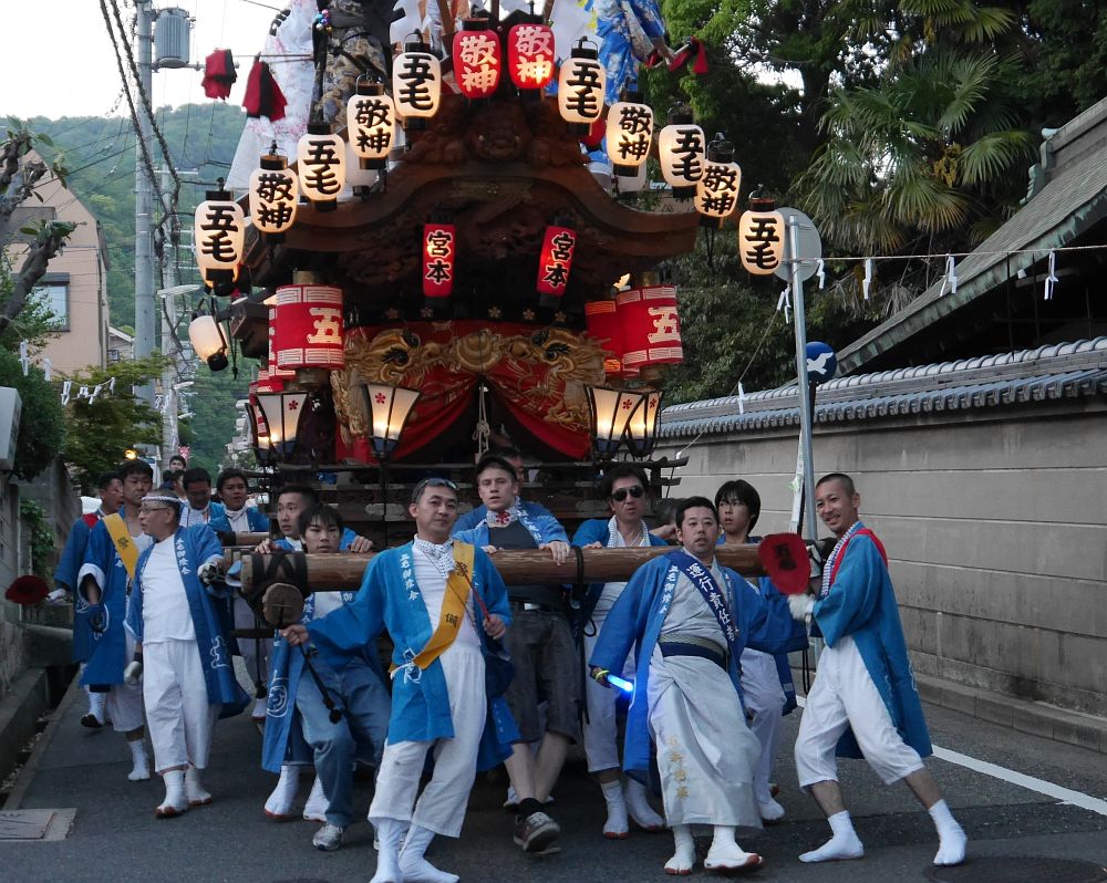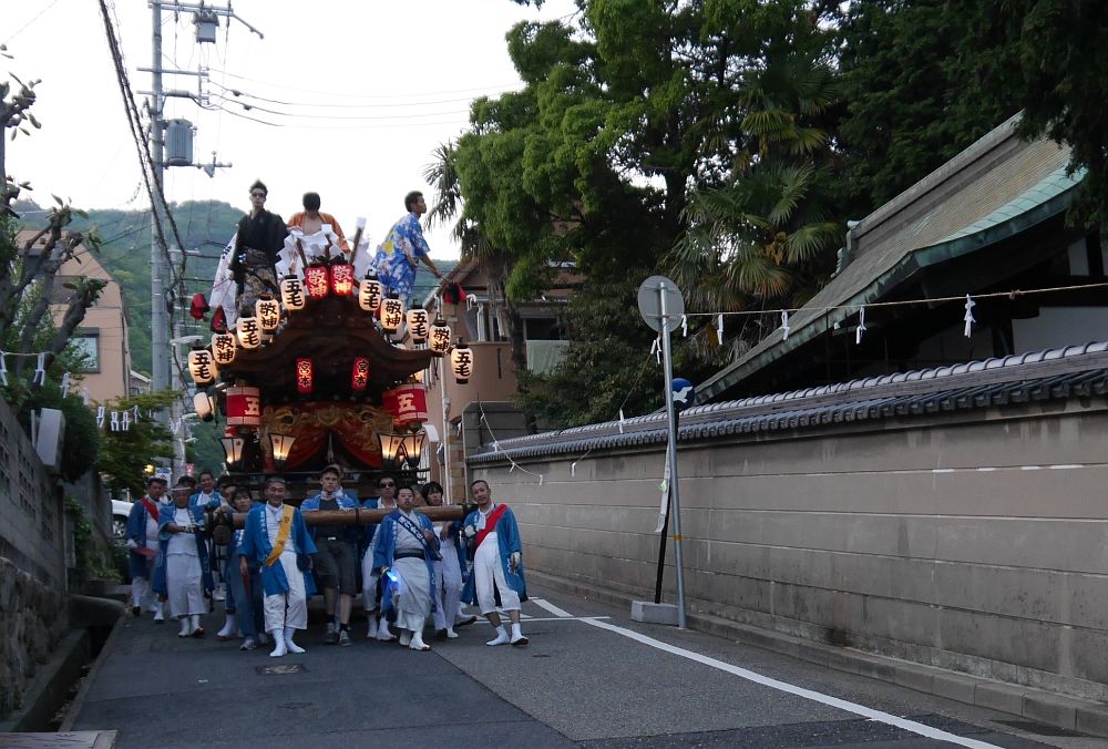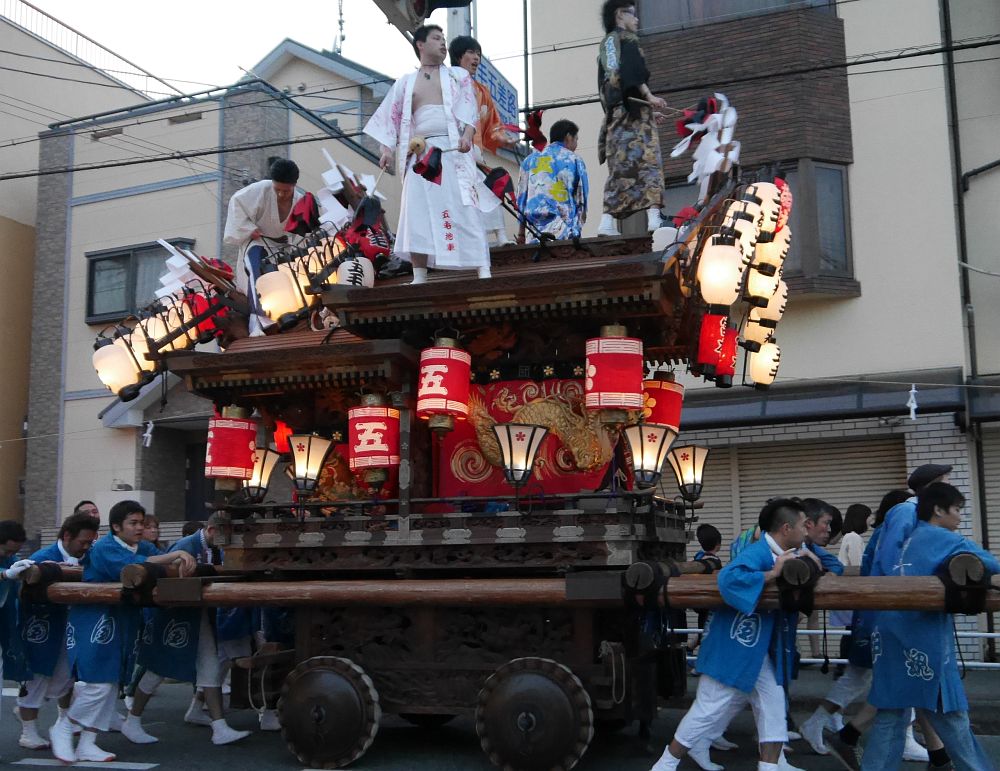 夕暮れ時の曳行、提灯の灯りが映えてきましたね。