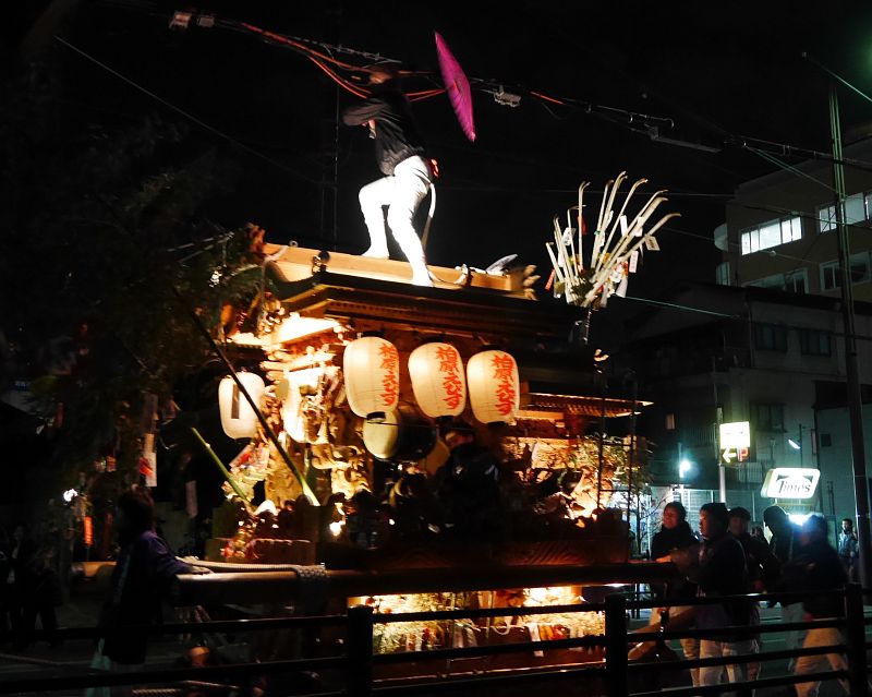 屋根方が番傘を振り回して屋根の上で踊ります。