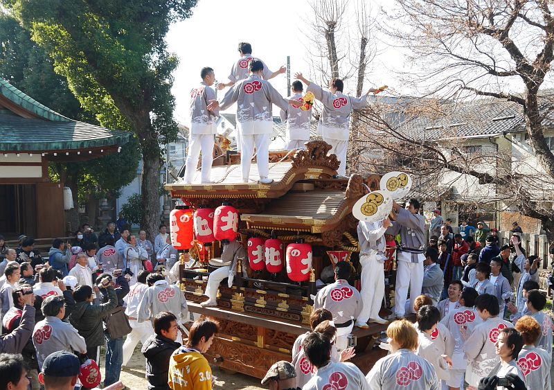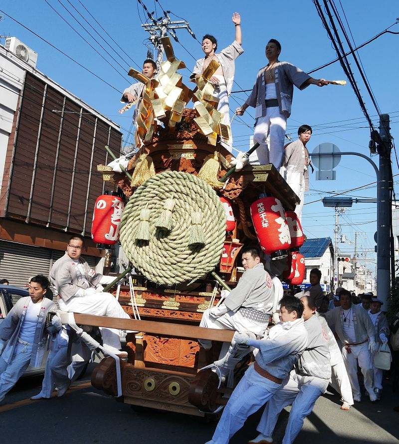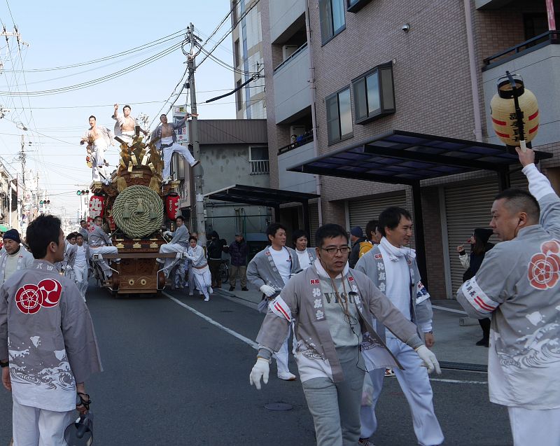 平成26年1月3日、平野区の杭全神社注連縄上げを見に行ってきました。 正月恒例の杭全神社注連縄上げだんじり曳行が行われました。 本年もこの注連縄上げだんじり曳行が最初のだんじり見物です。 注連縄上げは平野9地区が毎年交代で注連縄を神社に奉納する行事。 今年の当番町は野堂北組でした。 ここでは野堂北組地車の杭全神社から三十歩神社までの曳行の様子を紹介します。 では、杭全神社注連縄上げでの野堂北組地車画像4をご覧下さい。