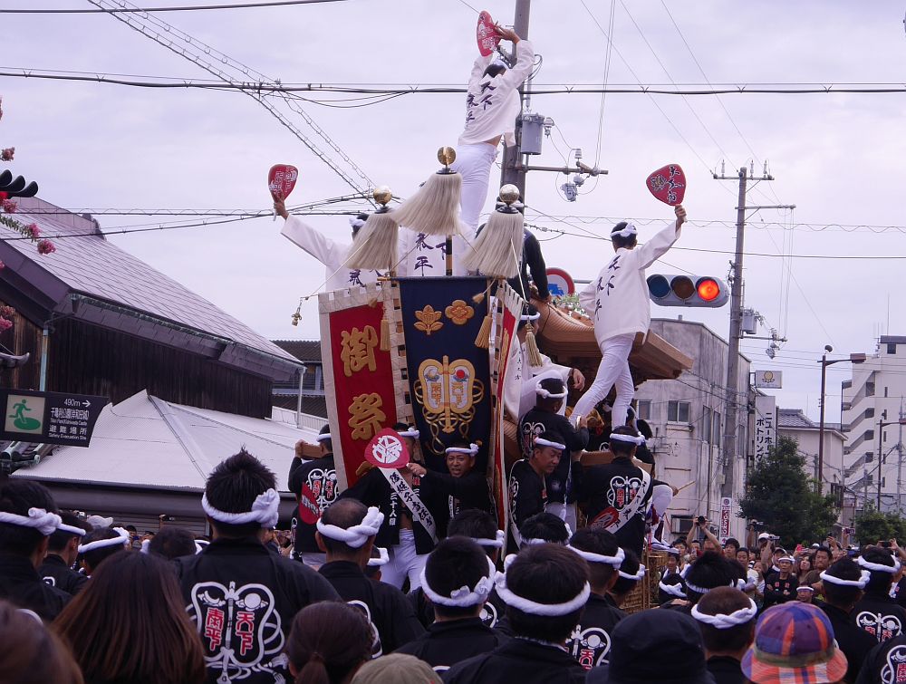 ひと回りしてきた中之濱町の纏が中町地車の前を通っていきます。