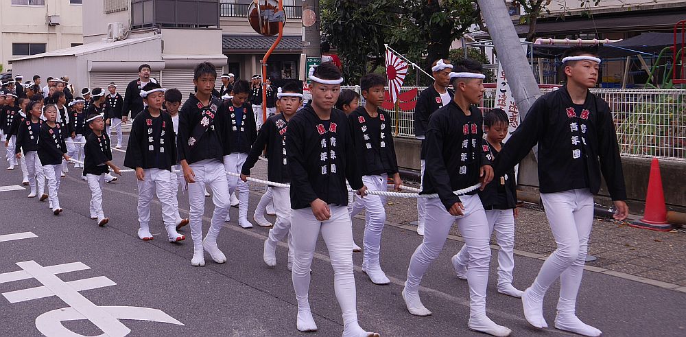 目の前でのやりまわし、曳き綱がこちらへ押し寄せてきます。