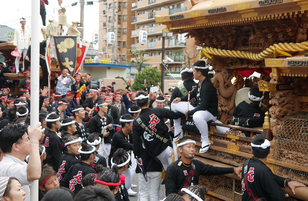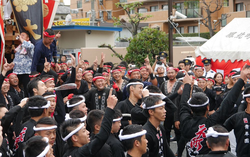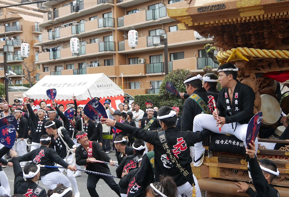 笛の合図とともに濱寺元町地車が大鳥地車の方へ近づいていきます。