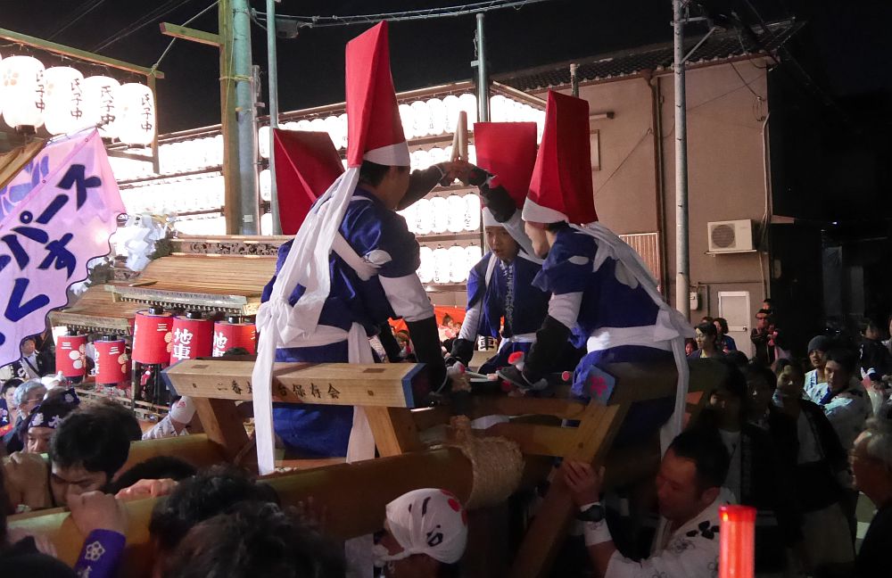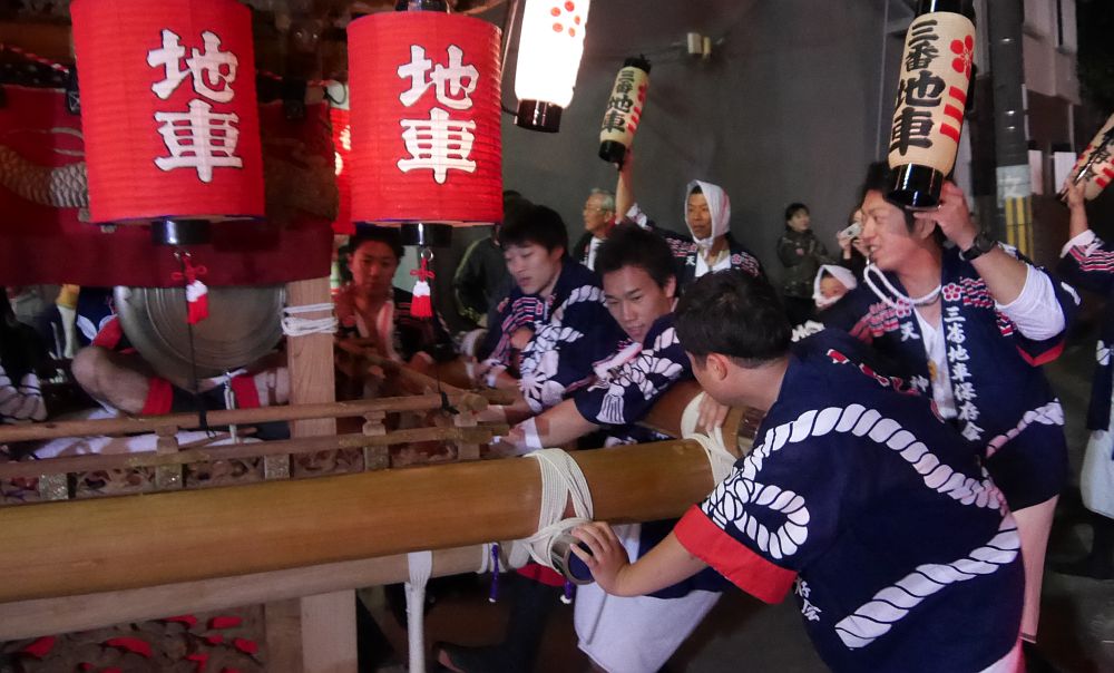 神社宮入が近づいてきたので、太鼓台は担ぎ上げての巡行です。