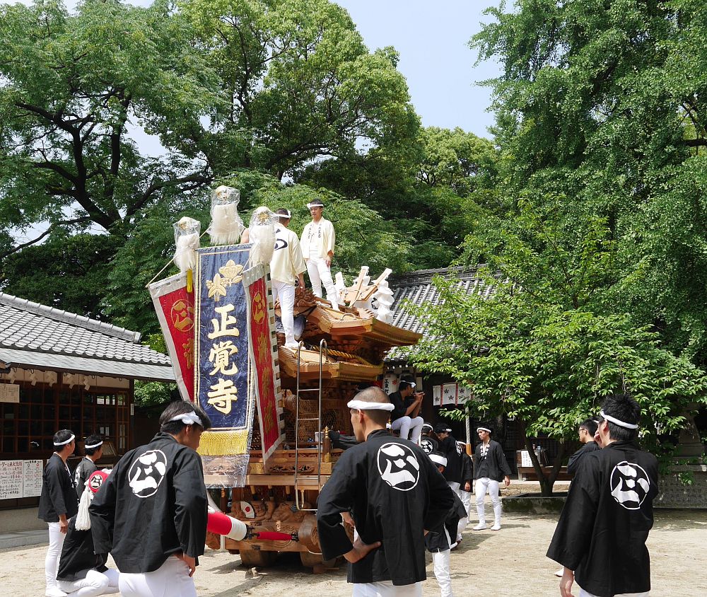 平成26年6月29日、平野区の正覚寺地車入魂式を見に行ってきました。 6月最終日曜の午前中に正覚寺地車の修理完成入魂式が行われました。 私は予定が入っていたので、見に行くのを諦めようか迷っていましたが、 少しだけでも見に行こうと平野区の旭神社h向かいました。 旭神社に着いたのは午前9時50分頃、境内では入魂式が行われていました。 正覚寺地車関係者の皆さん、地車修理完成入魂式おめでとうございます。 では、平野区の正覚寺地車入魂式画像をご覧下さい。