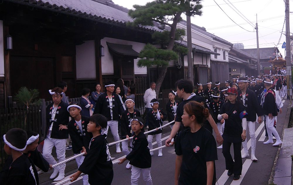 忠地から穴師小学校へ向かうええ雰囲気の旧道を我孫子の纏が戻ってきました。