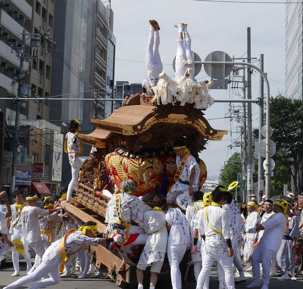 2号線 野田水道局前交差点で北之町と合わせ、担ぎ上げする南之町地車