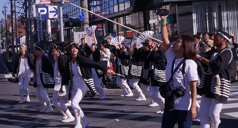曳行中も扇子を振り振り後ろ向きに進むガールズ
